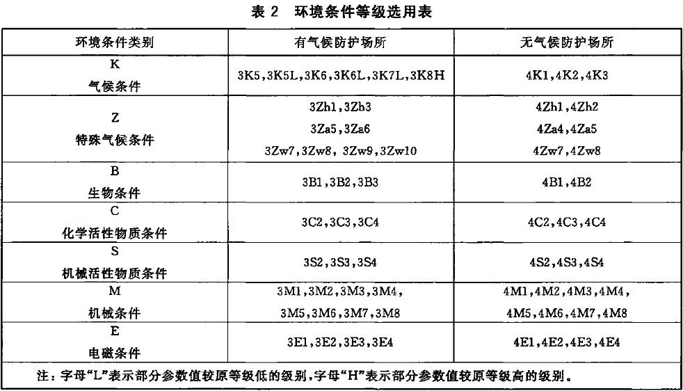 環(huán)境條件的種類包括z 氣候條件(K) 、特殊氣候條件(其中Zh 代表熱輻射條件;Za 代表周圍空氣運(yùn)動條件;Zw 代表除雨以外的水源、條件)、生物條件(B) 、化學(xué)活性物質(zhì)條件(C) 、機(jī)械活性物質(zhì)條件(S) 、機(jī)械環(huán)境條件(M)和電(E)磁環(huán)境條件 共七類。